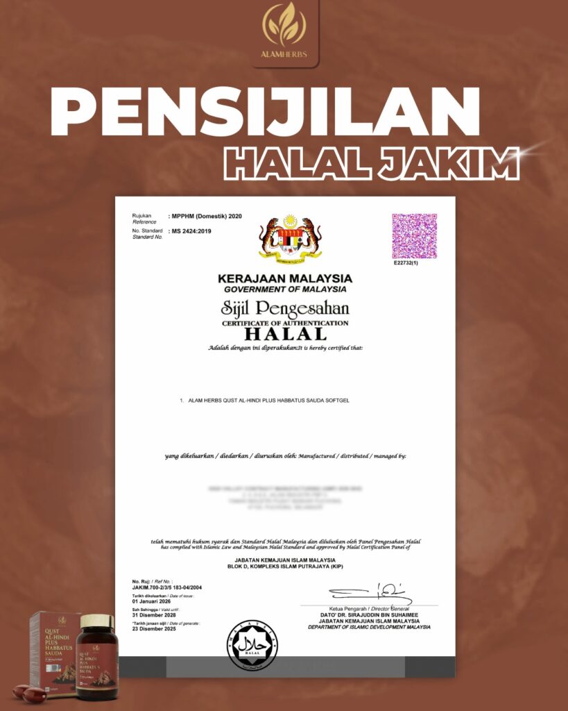 Produk Qust Al-Hindi Keluaran Alam Herbs Telah Mendapat Pengesahan Dari Badan-badan Yang Berkaitan. Gunakan tanpa was-was!